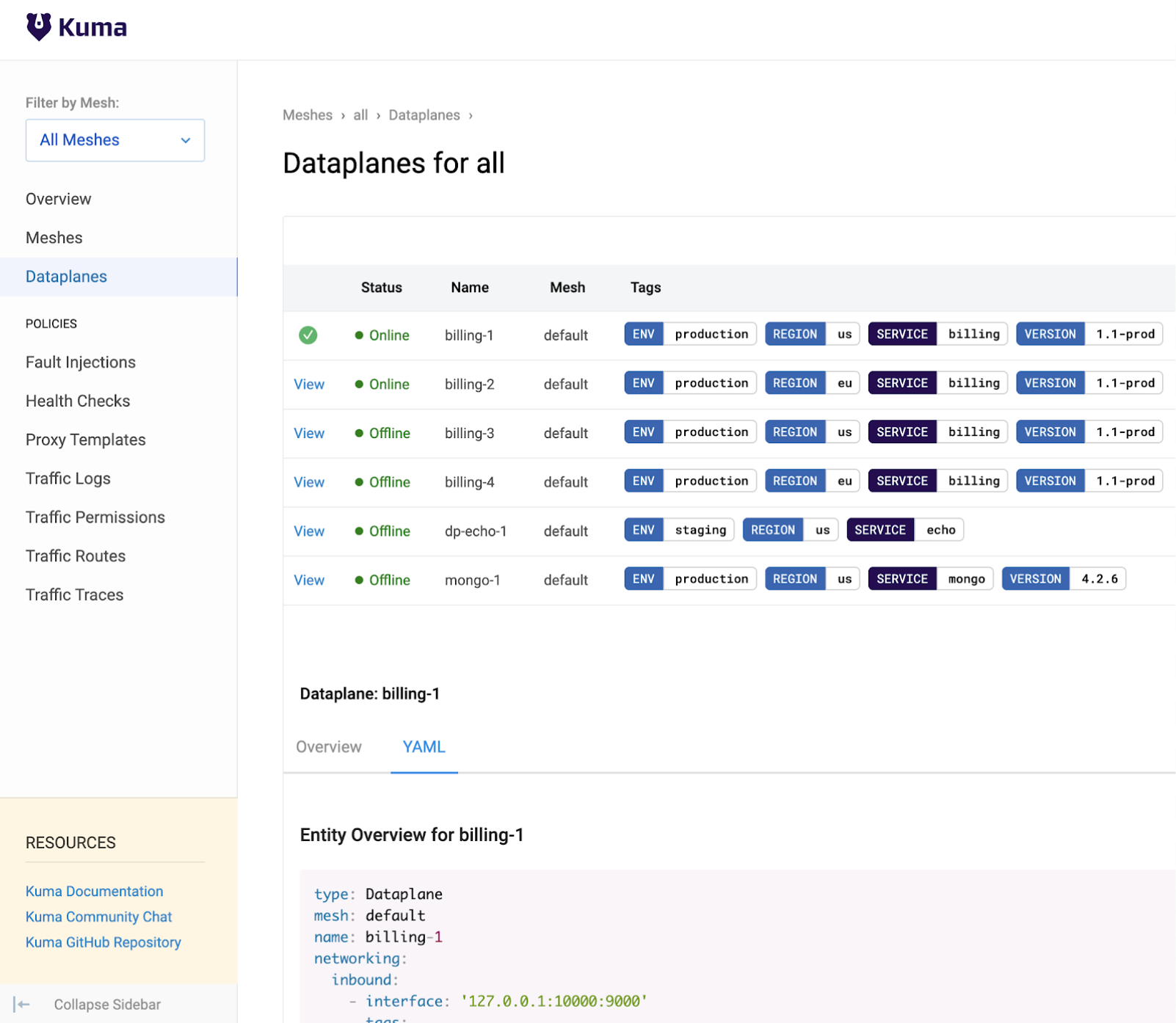We have revamped the GUI to support pagination, more scalable visualizations of the tables and individual resources, as well as introducing the first wizards with the goal of simplifying using Kuma: in this release we have shipped for Mesh and Dataplane resources, but more will be added in the next releases.