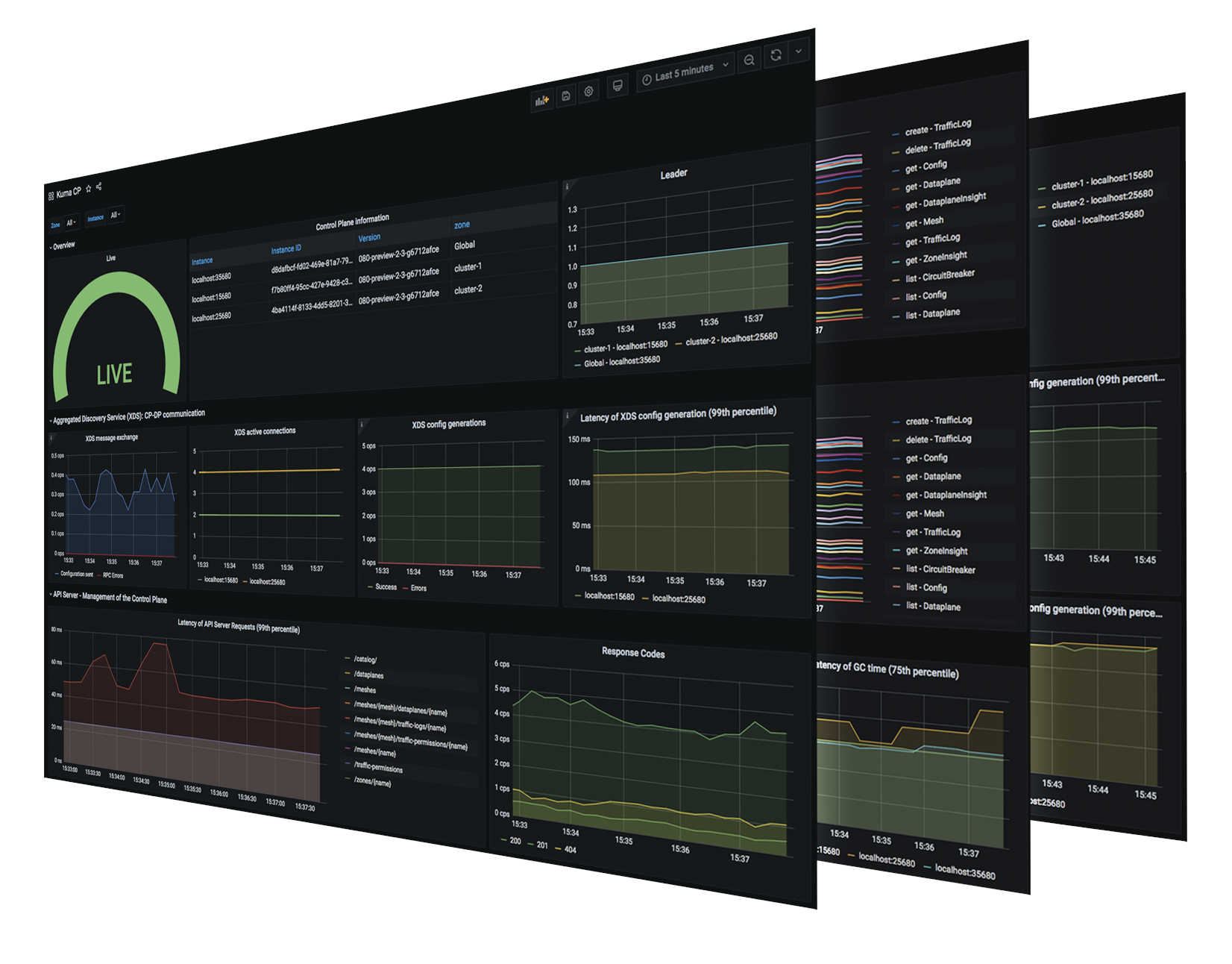 Kuma 1.0 ships with 65+ charts out of the box for Grafana, although you can collect data from any other system too with the TrafficLog and TrafficMetrics policies.