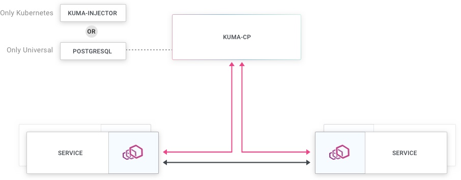 kubernetes: users configure Kuma via Kubernetes resources and Kuma uses the Kubernetes API server as the data store.universal: users configure Kuma via the Kuma API server and Kuma resources. PostgreSQL serves as the data store. This mode works for any infrastructure other than Kubernetes, though you can run auniversalcontrol plane on top of a Kubernetes cluster.