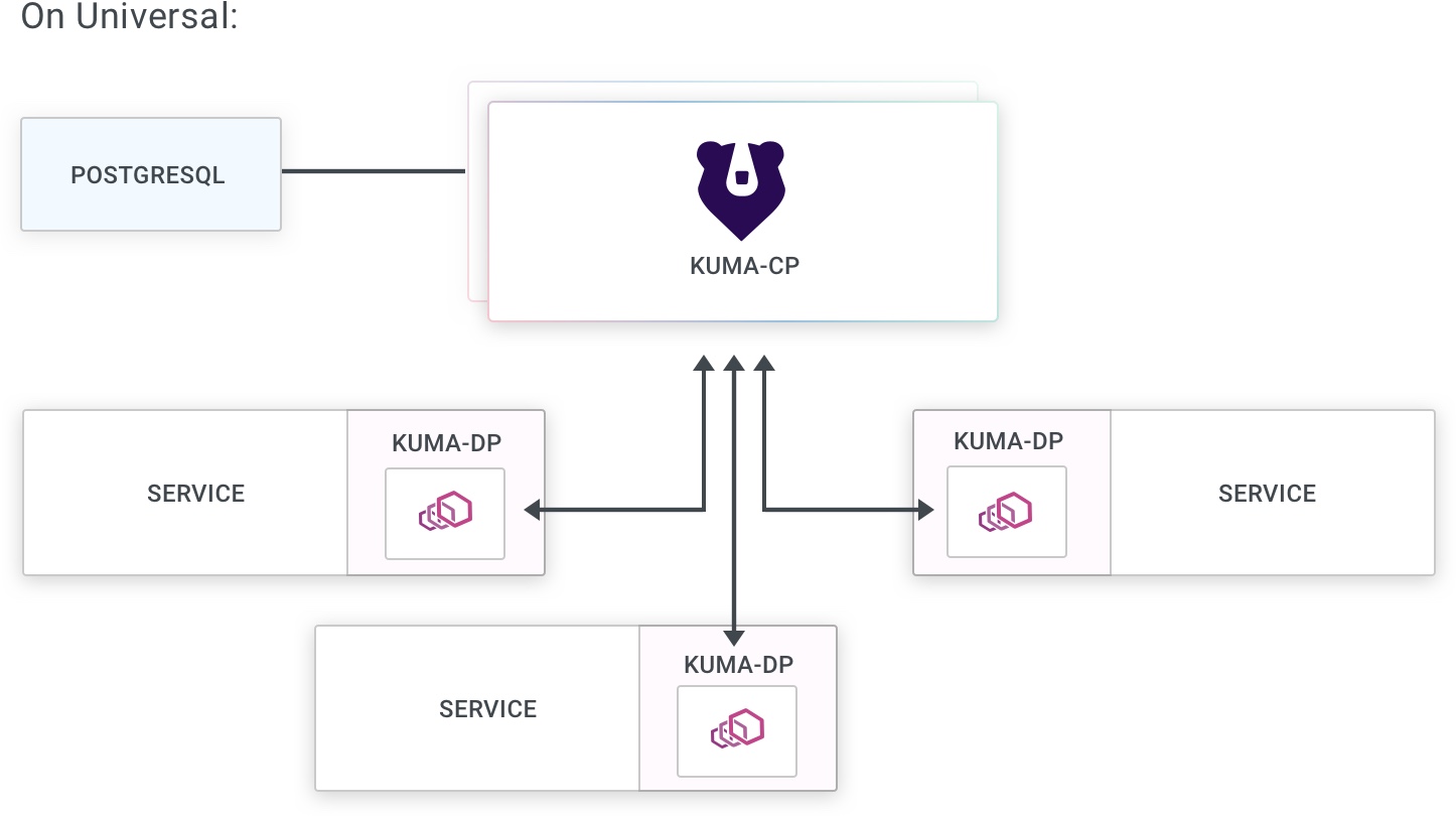 When running in Universal mode, Kuma requires a PostgreSQL database to store its state. This replaces the Kubernetes API. With Universal, you use kumactl to interact directly with the Kuma API server to manage policies.